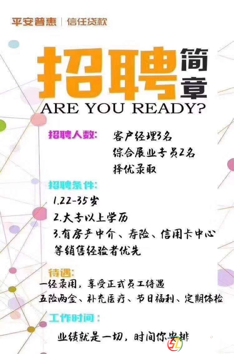 【招聘】: 平安普惠隸屬于平安集團(世界500強全球第39位),是中國最大的消費貸款提供商,全國近800家分公司,40000多名正式員工,貸款余額超2000億,準上市公司。 招聘崗位:信貸經(jīng)理 工作內(nèi)容:開發(fā)貸款意向客 ...